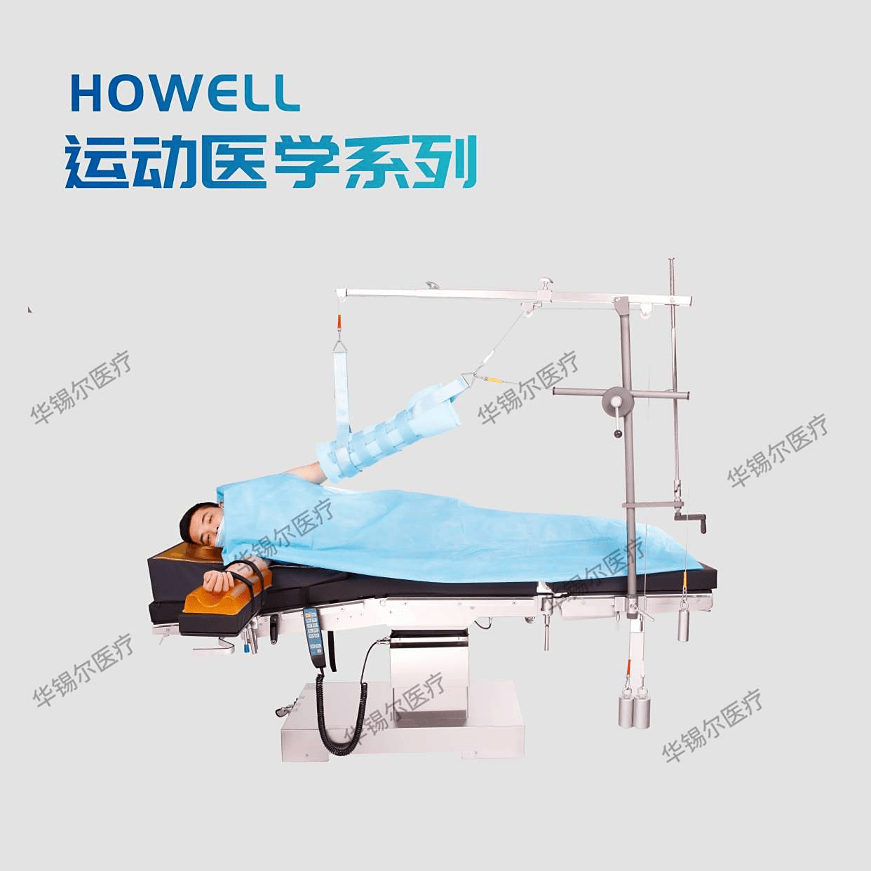 華錫爾肩關(guān)節(jié)鏡牽引系統(tǒng)則為臨床提供了真正可靠的手術(shù)支撐。傳統(tǒng)單點牽引方式難以避免受力不均以及術(shù)中位移的問題,而華錫爾牽引系統(tǒng)采用了三點式設計。手術(shù)時,會配備專業(yè)的肩關(guān)節(jié)袖套與多段可調(diào)牽引裝置。將患者手臂經(jīng)袖套固定后,通過三條獨立的鋼絲繩連接到牽引架上。另一側(cè)則可根據(jù)患者的體型以及手術(shù)需求,靈活配置不同重量的砝碼進行調(diào)節(jié)。這種設計在保證手臂穩(wěn)固固定的同時,還能有效避免局部壓力過大,提升了患者術(shù)中的舒適度與安全性。